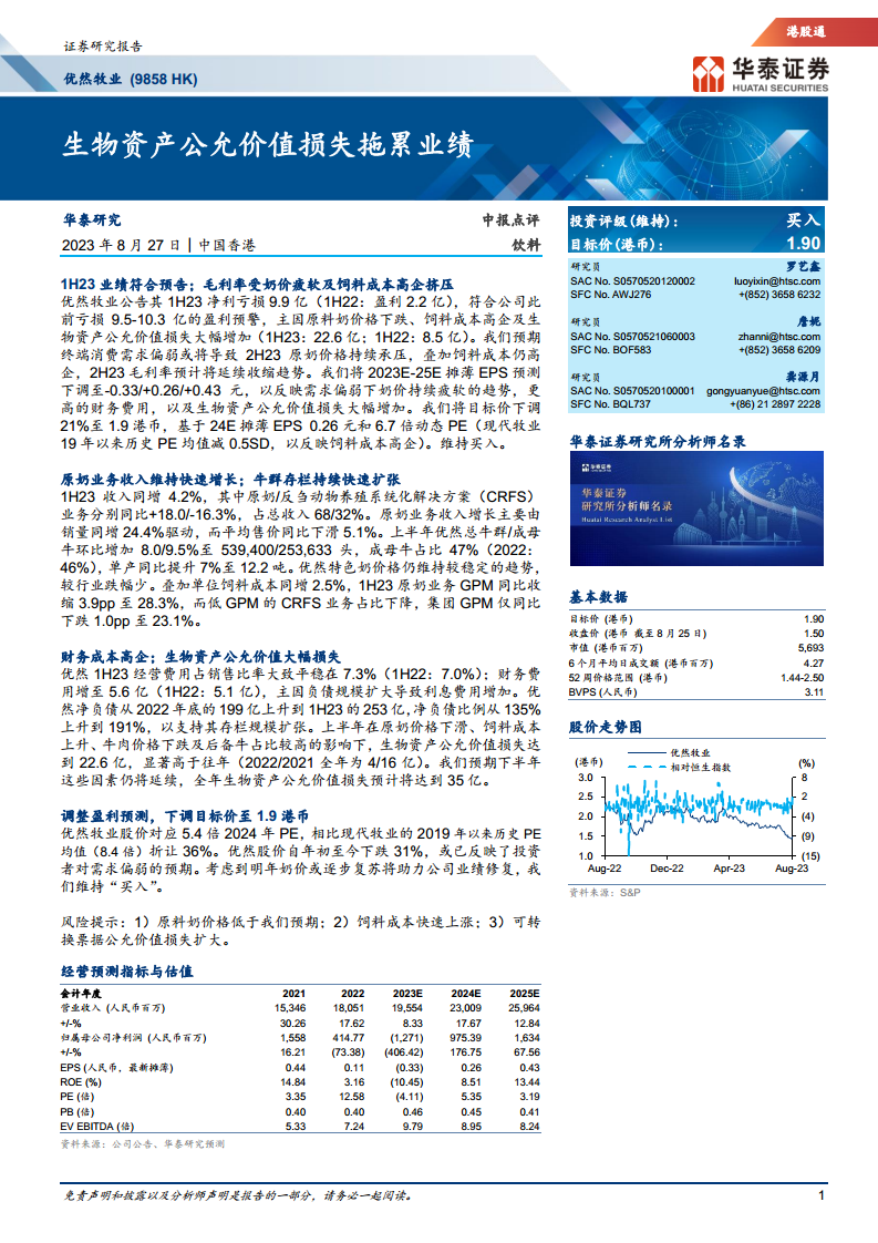 2023年上半年,公司经营费用占销售比率大致平稳在7.3%(2022年上半年为7.0%)。财务费用增至5.6亿人民币(2022年上半年为5.1亿人民币),主要原因是为支持存栏规模扩张而导致的负债规模扩大。公司净负债从2022年底的199亿人民币上升到2023年上半年的253亿人民币,净负债比例从135%上升到191%。生物资产公允价值损失达到22.6亿人民币,显著高于往年(2022/2021全年分别为4亿/16亿人民币)。这主要受原奶价格下滑、饲料成本上升、牛肉价格下跌以及后备牛占比较高等因素的综合影响。华泰研究预期下半年这些不利因素仍将延续,全年生物资产公允价值损失预计将达到35亿人民币。