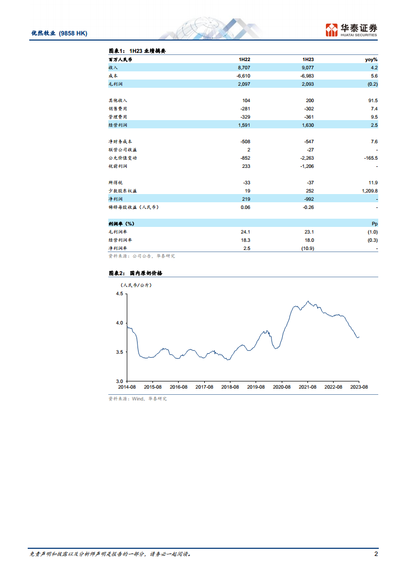 优然牧业2023年上半年净亏损9.9亿人民币,与2022年同期的盈利2.2亿人民币形成鲜明对比,并符合公司此前9.5亿至10.3亿人民币的亏损预警。导致亏损的主要因素包括:原料奶价格下跌、饲料成本持续高企,以及生物资产公允价值损失大幅增加,从2022年上半年的8.5亿人民币激增至2023年上半年的22.6亿人民币,同比增幅高达165.5%。华泰研究预计,终端消费需求偏弱将导致2023年下半年原奶价格持续承压,叠加饲料成本仍处于高位,公司毛利率预计将延续收缩趋势。