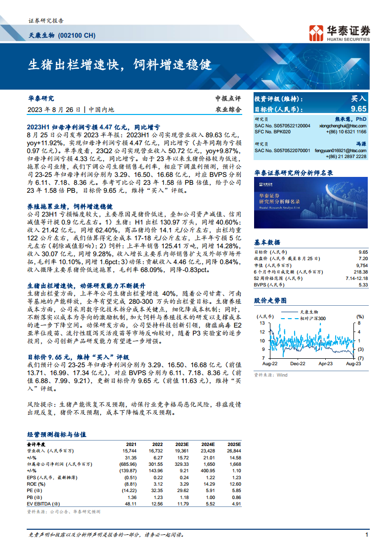 天康生物2023年上半年业绩受生猪价格低迷影响,出现较大亏损,但公司在生猪出栏量方面实现了快速增长,饲料业务也保持了稳健的增长态势。公司积极通过数字化技术和激励机制优化成本结构,并持续加大动保研发投入以提升核心竞争力。华泰研究基于对生猪市场行情的判断,下调了公司未来三年的盈利预测和目标价,但考虑到公司在生猪养殖规模扩张、成本控制以及动保研发方面的努力和潜力,维持“买入”评级。投资者需关注猪价波动、疫情及市场竞争等风险因素。
