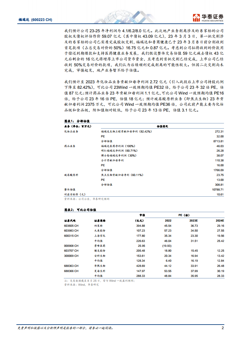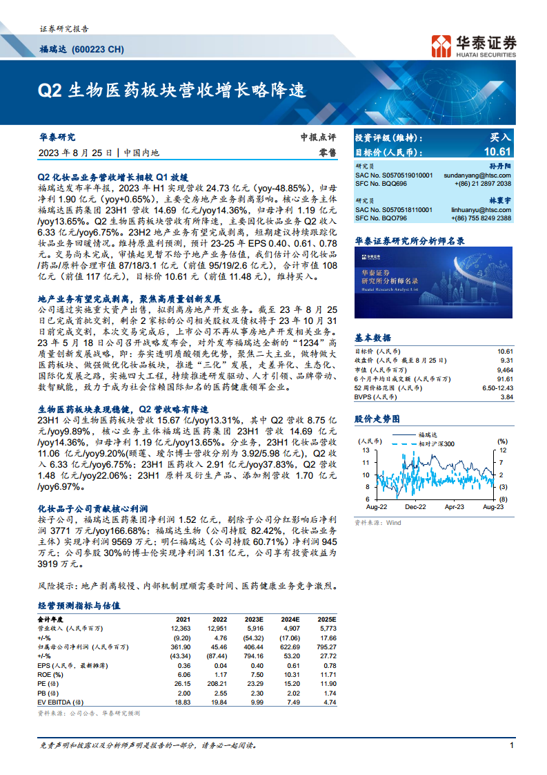 福瑞达正通过剥离房地产业务,坚定地向生物医药健康领域转型,并已制定清晰的“1234”高质量创新发展战略。尽管2023年第二季度化妆品业务增速有所放缓,但公司整体生物医药板块上半年仍保持稳健增长,核心业务主体福瑞达医药集团表现良好。分析师基于公司战略转型、核心业务增长潜力及分部估值,维持“买入”评级,目标价10.61元,看好公司长期发展。投资者需关注地产剥离的最终完成情况、内部整合进程以及市场竞争带来的潜在风险。