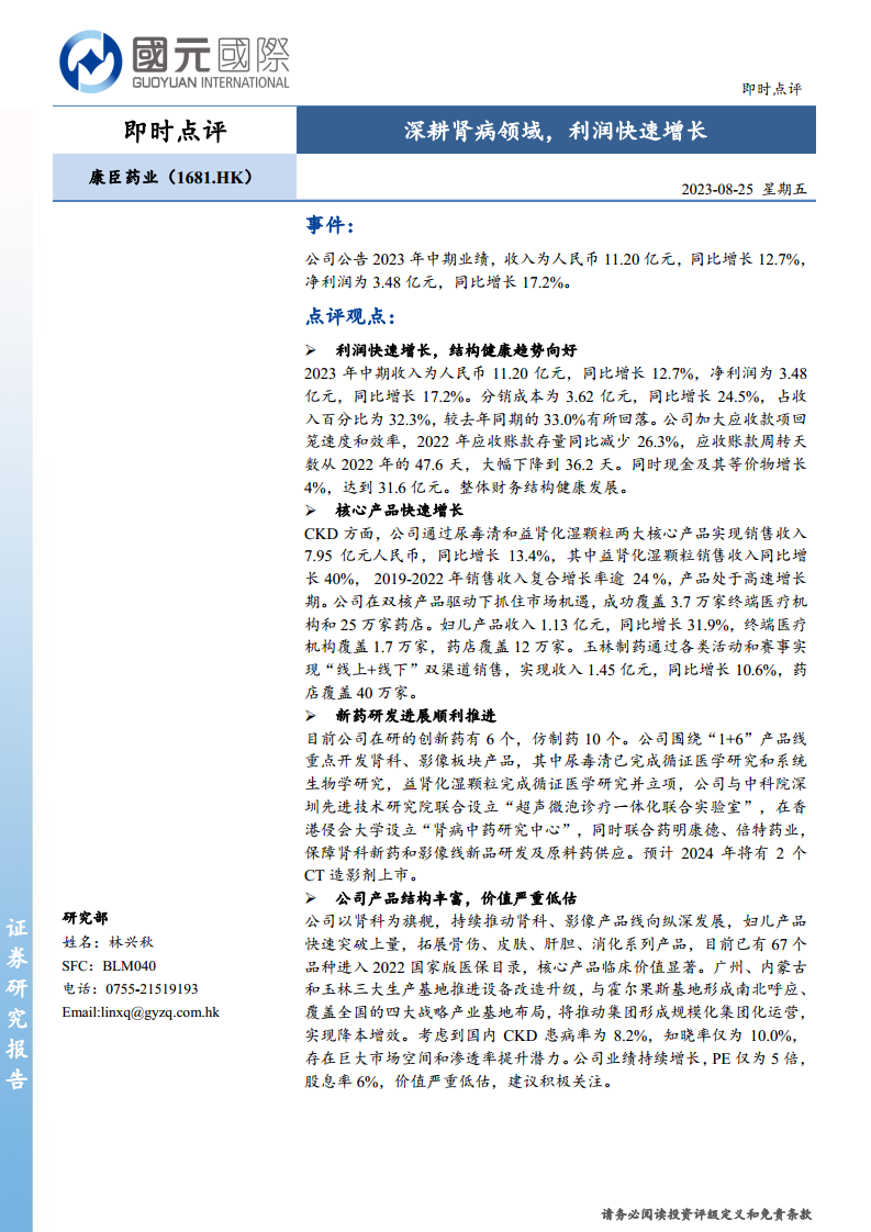 康臣药业(01681):深耕肾病领域,利润快速增长