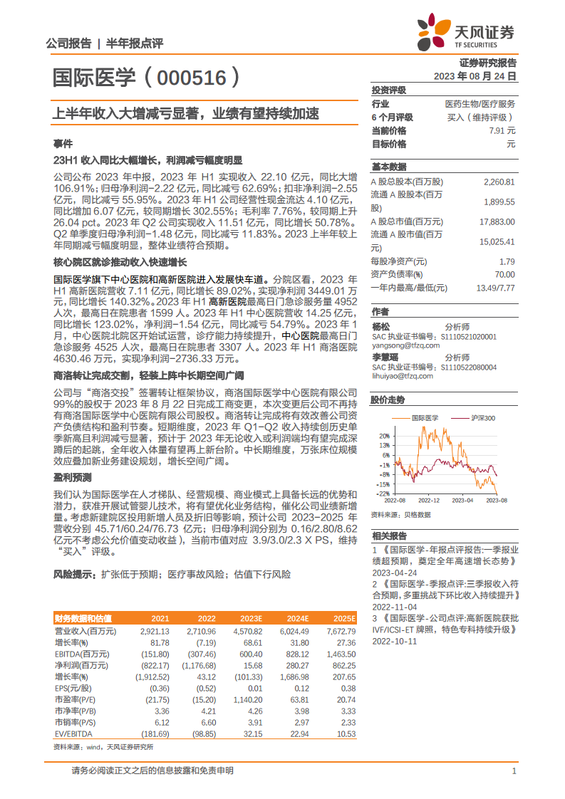 国际医学(000516):上半年收入大增减亏显著,业绩有望持续加速