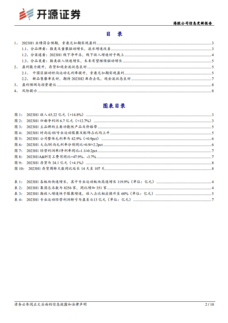 - 截至2023年上半年,索康尼门店数为80家,相比年初净增11家,同比净增34家,年初以来新拓10家加盟店,平均月店效预计超过30万元。5月,索康尼成为集团旗下首个入驻上海运营中心的品牌,6月在内地推出首间第三代形象店,门店从展示专业运动形象进化为提供多场景体验。