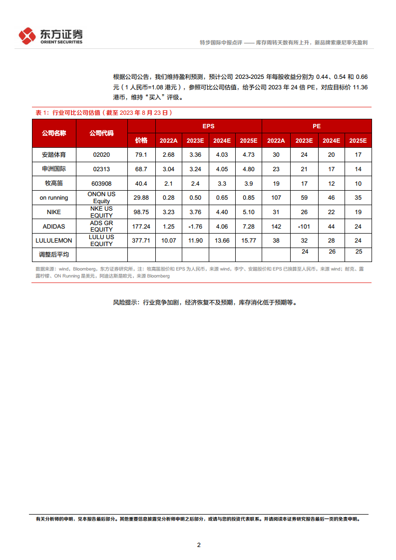 基于公司公告及当前业绩表现,东方证券维持对特步国际的盈利预测,预计公司2023-2025年每股收益分别为0.44元、0.54元和0.66元人民币。参照可比公司估值,给予公司2023年24倍PE,对应目标价11.36港币(按1人民币=1.08港元汇率计算),并维持“买入”评级。这表明分析师对公司未来的增长潜力和盈利能力持乐观态度,尤其看好新品牌的长期发展。