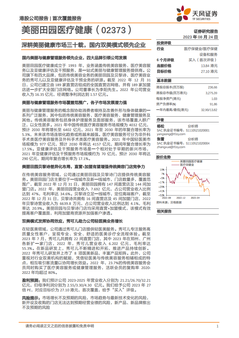 选取固生堂、医思健康、海吉亚医疗和锦欣生殖作为可比公司,2023-2025年H股行业平均PE为27.62/20.49/15.91倍。美丽田园医疗健康作为美丽与健康管理服务市场的领先企业,前瞻性布局医疗美容服务和亚健康评估及干预市场,具有较大增长潜力。给予公司2023年27倍PE,对应目标价为27.10港元,首次覆盖,给予“买入”评级。