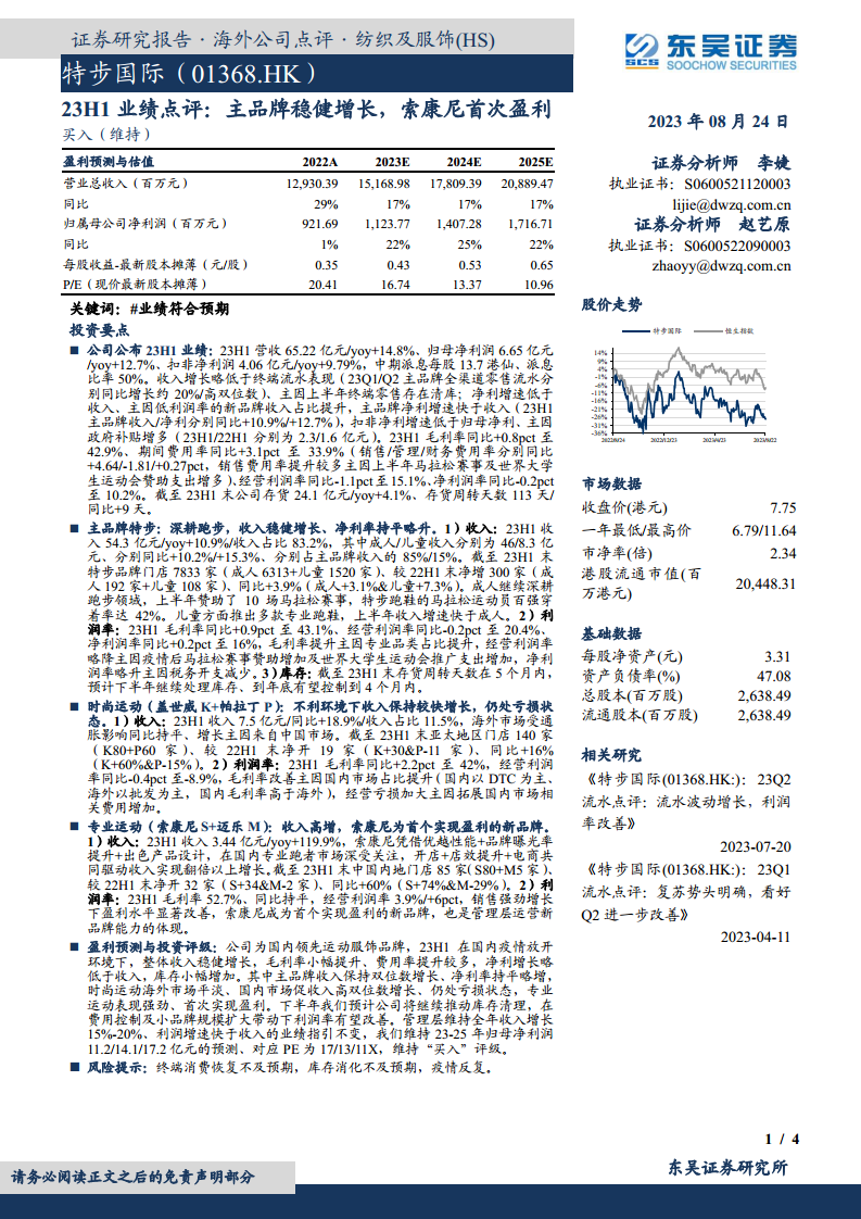 特步国际作为国内领先的运动服饰品牌,在23H1国内疫情放开的环境下,整体收入实现稳健增长。尽管毛利率小幅提升,但费用率提升较多,导致净利润增长略低于收入增长,且库存小幅增加。展望下半年,公司预计将继续推动库存清理,并在费用控制以及小品牌规模扩大带来的协同效应下,利润率有望得到改善。管理层维持全年收入增长15%-20%、利润增速快于收入的业绩指引不变。东吴证券维持对公司2023-2025年归母净利润分别为11.2亿元、14.1亿元和17.2亿元的预测,对应PE分别为17倍、13倍和11倍,并维持“买入”评级。