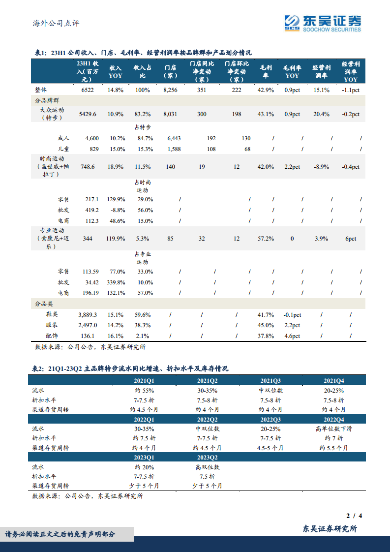 截至23H1末,特步主品牌存货周转天数在5个月内。公司预计下半年将继续处理库存,目标到年底控制在4个月内。23Q1和23Q2主品牌全渠道零售流水分别同比增长约20%和高双位数,折扣水平维持在7-7.5折和7.5折,渠道存货周转均少于5个月,显示出库存状况的逐步改善。