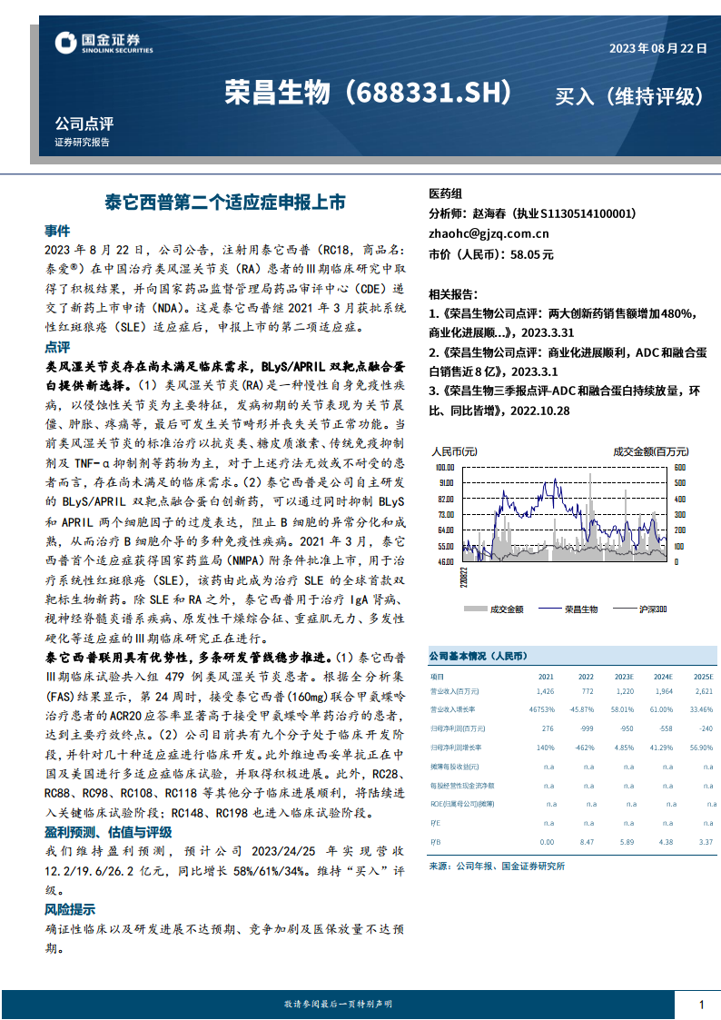 本报告的核心观点聚焦于荣昌生物自主研发的创新药泰它西普(RC18,商品名:泰爱®)在类风湿关节炎(RA)治疗领域取得的积极临床进展及其广阔的市场前景。泰它西普作为全球首款BLyS/APRIL双靶点融合蛋白,在继系统性红斑狼疮(SLE)适应症获批后,其RA适应症的Ⅲ期临床研究也取得了积极结果并已递交新药上市申请(NDA),标志着公司在自身免疫疾病治疗领域迈出了重要一步。RA市场存在显著的未满足临床需求,泰它西普的联用优势和独特作用机制有望为患者提供新的治疗选择,从而驱动公司业绩增长。