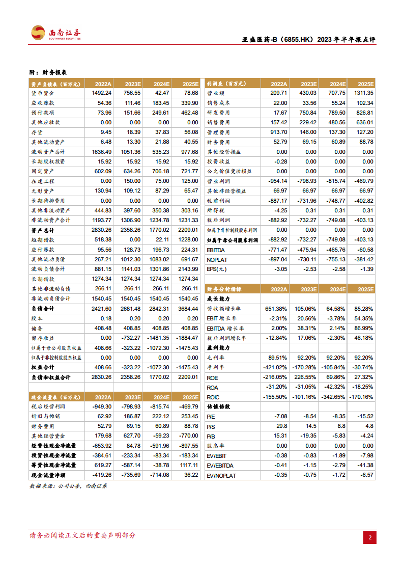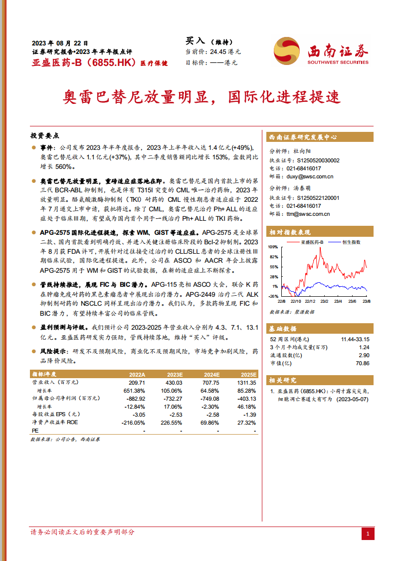 亚盛医药在2023年上半年展现出强劲的增长势头,核心产品奥雷巴替尼销售额显著放量,并有望通过新适应症的获批进一步扩大市场份额。同时,APG-2575的国际化进程加速,以及多款创新管线药物的持续推进,共同构筑了公司未来的增长潜力。尽管公司目前仍处于战略性亏损阶段,但营收高速增长和亏损收窄的趋势表明其盈利能力正在逐步改善。鉴于其强大的研发实力和不断落地的产品管线,维持“买入”评级,但需警惕研发、商业化、市场竞争及药品降价等风险。