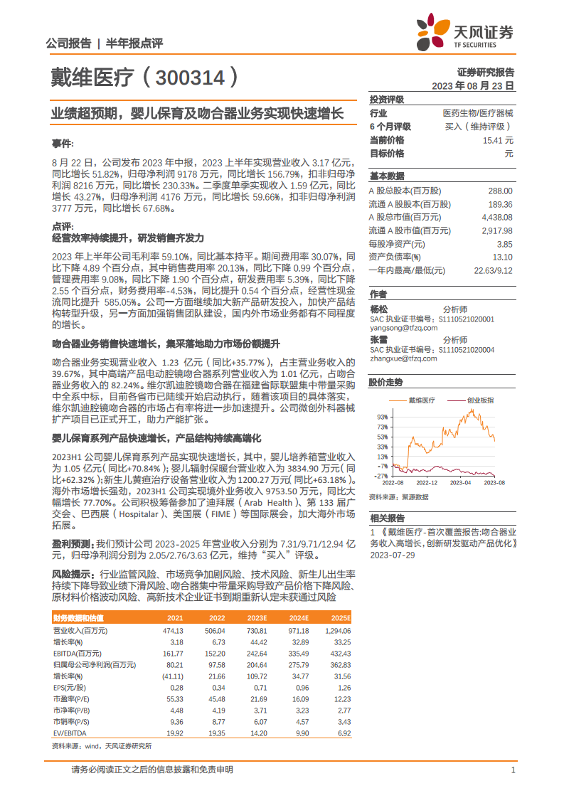 戴维医疗在2023年上半年取得了令人瞩目的业绩,营业收入和归母净利润均实现高速增长,远超市场预期。这主要得益于公司在婴儿保育和吻合器两大核心业务上的强劲表现,特别是高端产品的市场渗透率不断提升。同时,公司通过优化经营效率、控制费用、加大研发投入以及积极拓展海外市场,进一步巩固了其市场地位和盈利能力。吻合器业务在集采中中标,以及婴儿保育系列产品的持续高端化,为公司未来发展注入了强大动力。尽管面临行业监管、市场竞争和新生儿出生率下降等风险,但公司凭借其稳健的经营策略和持续的创新能力,预计未来仍将保持良好的增长态势,因此维持“买入”评级。