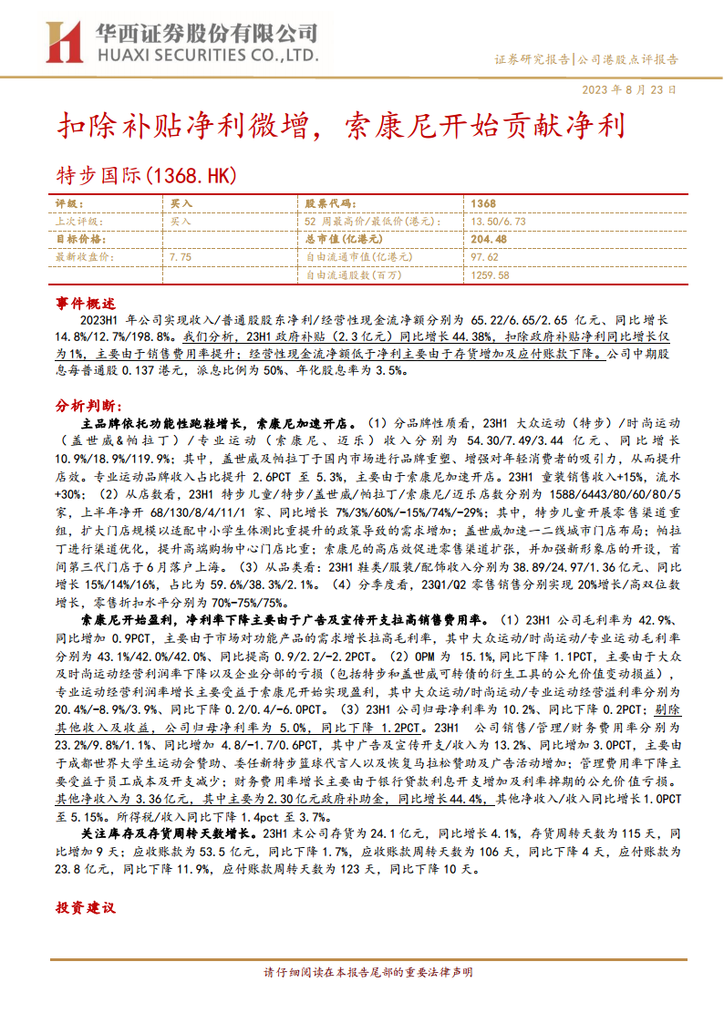 特步国际(01368):扣除补贴净利微增,索康尼开始贡献净利