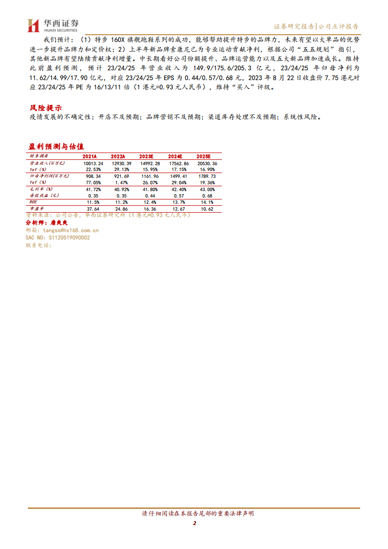 特步国际2023年上半年业绩表现稳健,收入和净利润均实现双位数增长。专业运动品牌索康尼的盈利贡献是亮点,推动了专业运动板块的高速增长。然而,扣除政府补贴后净利润增速放缓,以及销售费用率因加大广告宣传投入而提升,对盈利能力构成一定压力。同时,存货周转天数的增加也需关注。展望未来,公司核心品牌特步的旗舰产品有望持续提升品牌力,新品牌矩阵的成长潜力巨大。鉴于公司多元品牌策略的有效性及中长期增长前景,报告维持“买入”评级,并提供了积极的盈利预测。