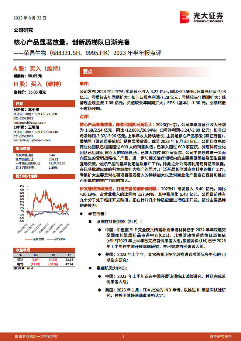 荣昌生物2023年上半年业绩显示,核心产品泰它西普和维迪西妥单抗销售显著放量,推动营收实现20.56%的同比增长。公司持续投入巨额资金用于研发,上半年研发投入达5.40亿元,占营收比例超过127%,以加速推进九个分子的临床开发,构建全面的创新药梯队。尽管高研发投入和商业化推广导致净利润亏损扩大,但多项在研产品在中美两国均取得积极临床进展,预示着未来的增长潜力。鉴于市场竞争和政策调整,公司下调了未来三年的营收和净利润预测,但预计亏损将逐年收窄,并维持“买入”评级,同时提示了研发、销售和国际合作可能面临的风险。