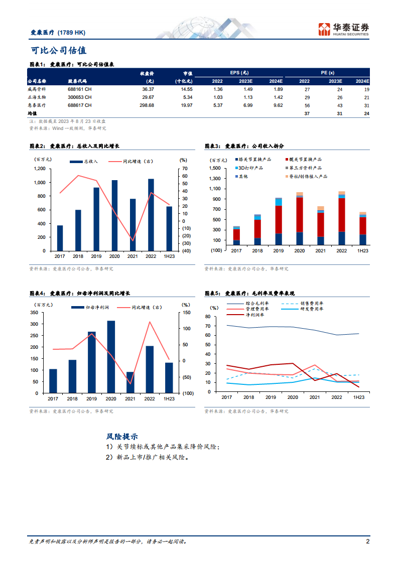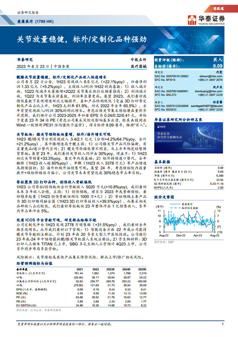 爱康医疗在2023年上半年实现了稳健的收入增长,并通过产品结构优化(特别是3D打印和定制化产品)有效提升了毛利率。尽管短期内净利润增速受高基数影响,但公司在关节业务(尤其是膝关节、标外和海外市场)表现强劲,并积极布局脊柱3D打印、ICOS定制化平台、智能设备和骨生物材料等创新领域,为未来增长奠定了坚实基础。华泰研究维持“买入”评级,并基于对公司集采风险出清后增长潜力的认可,给予9.09港币的目标价。公司预计全年收入和利润将实现30%的同比增长,未来盈利能力和市场份额有望持续提升,但仍需关注集采降价和新品推广等潜在风险。