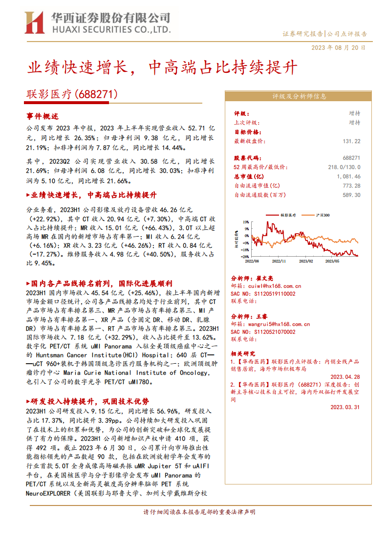 联影医疗发布2023年中报,报告期内公司业绩实现快速增长。