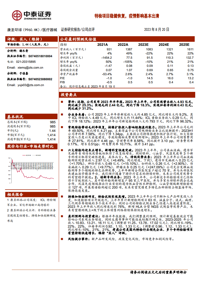 康圣环球在2023年上半年成功应对了新冠检测业务的急剧萎缩,通过其核心ICL特检业务的强劲复苏实现了业绩的结构性优化。尽管短期内为战略扩张而增加的投入导致净利润承压,但这些投资正加速公司在“6+3”特检版图的布局,推动传统优势专科稳健增长,并使创新专科业务取得突破性进展。同时,公司在研发和特检试剂业务上的高速增长,进一步巩固了其在特检行业的领先地位。展望未来,随着下游诊疗需求的持续好转和公司战略布局的逐步兑现,康圣环球有望实现持续快速增长,但仍需关注新产品研发、政策变化及市场竞争加剧等潜在风险。