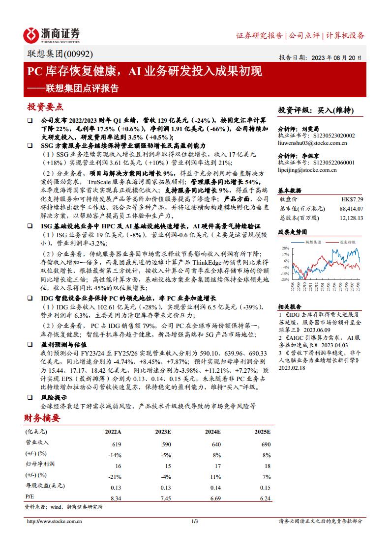 联想集团(00992)点评报告:PC库存恢复健康,AI业务研发投入成果初现