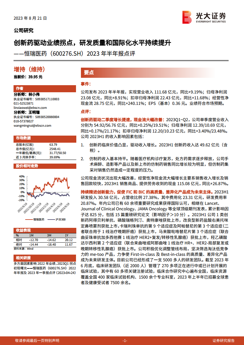 恒瑞医药2023年上半年业绩实现显著增长,创新药收入成为核心驱动力,同时经营性现金流大幅改善,显示出公司经营效率和财务健康状况的提升。公司持续加大研发投入,聚焦高质量差异化创新,并取得了多项新药及适应症的获批。在国际化战略方面,通过多项重磅对外授权和海外临床研究的突破,公司正逐步实现创新药的全球价值变现。这些积极进展共同预示着公司业绩拐点的到来,并为其长期可持续发展奠定坚实基础。分析师维持“增持”评级,看好公司未来盈利能力和市场表现。
