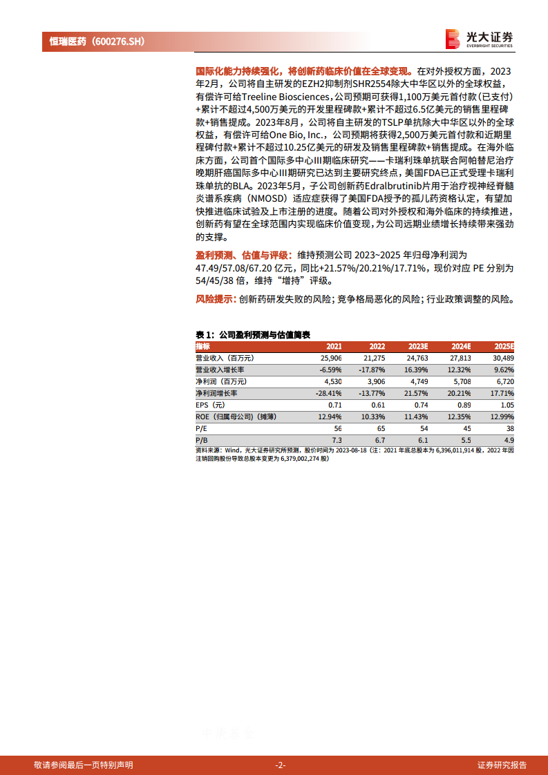 光大证券研究所维持对恒瑞医药2023~2025年归母净利润的预测,分别为47.49亿元、57.08亿元和67.20亿元,同比增速分别为+21.57%、+20.21%和+17.71%。当前股价对应PE分别为54倍、45倍和38倍。维持“增持”评级。