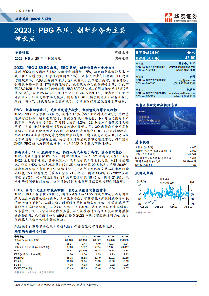 海康威视2023年第二季度业绩显示,公司收入同比增长3.1%,归母净利润同比增长1.5%,基本符合华泰研究预期。报告指出,公共事业业务(PBG)受地方财政影响持续承压,而创新业务则成为公司主要的增长引擎,整体实现17%的高速增长,其中机器人和汽车电子业务表现尤为突出,萤石网络业务也实现复苏。鉴于业务复苏的缓慢态势,华泰研究下调了公司2023-2025年的归母净利润预测至158/180/208亿元,并将目标价下调至43元人民币(原值51元),但基于公司行业龙头地位、有望率先受益于行业复苏以及AI大模型赋能业务的潜力,维持“买入”评级。