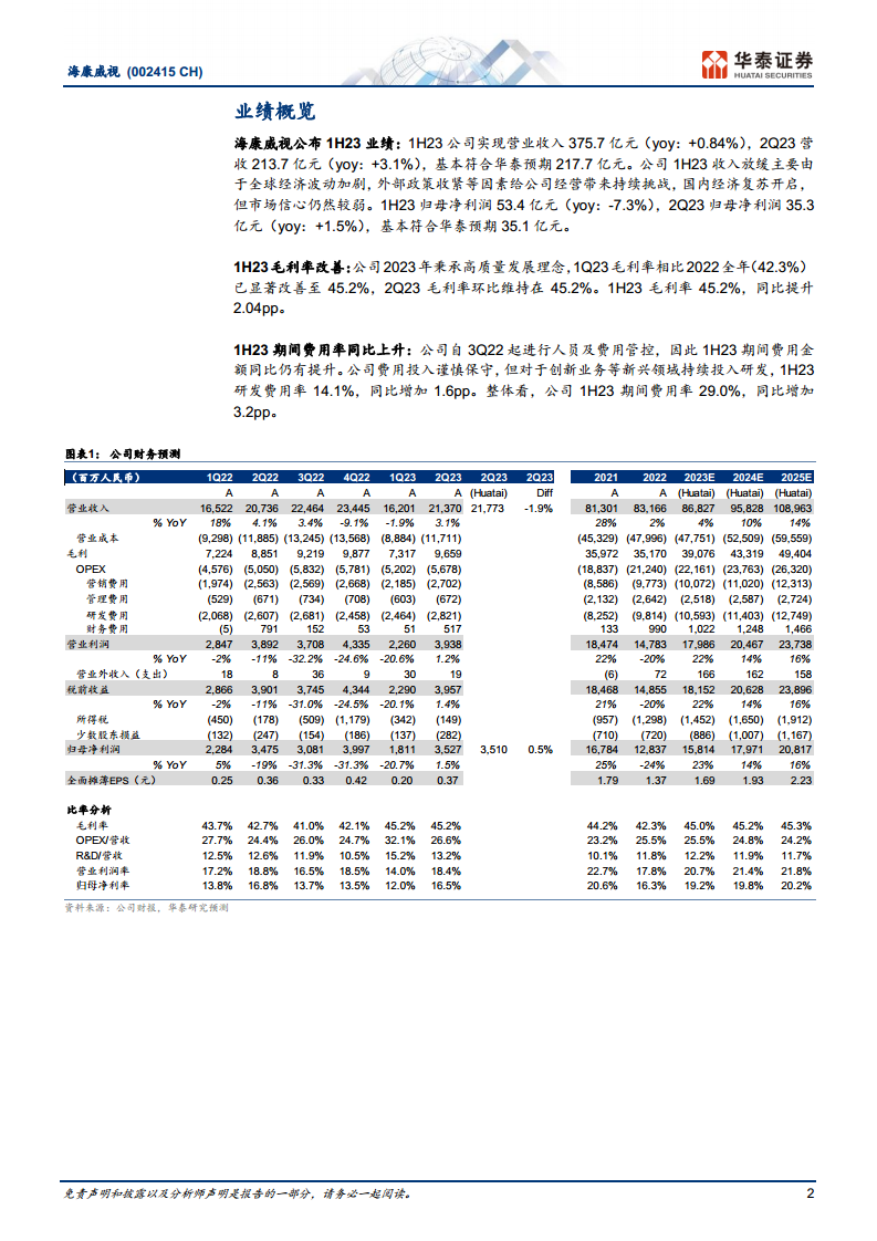 - 海康威视2023年上半年实现营业收入375.7亿元,同比增长0.84%;第二季度营业收入213.7亿元,同比增长3.1%,基本符合华泰研究217.7亿元的预期。