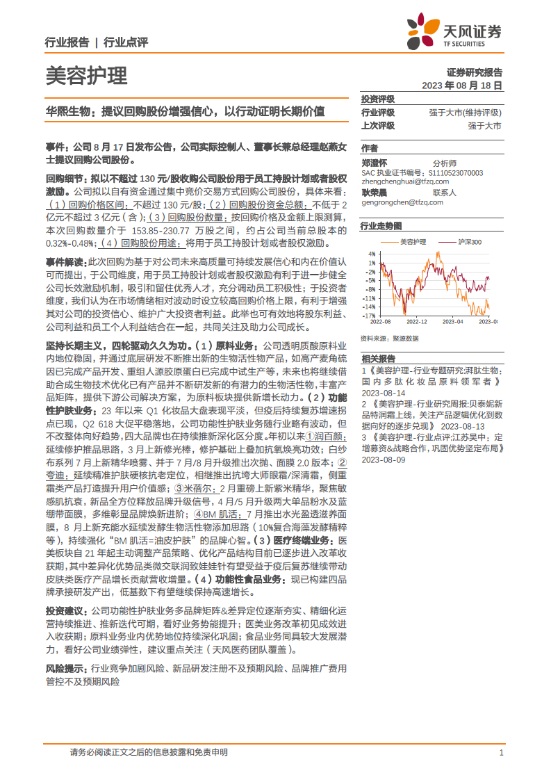 华熙生物于2023年8月17日发布公告,公司实际控制人、董事长兼总经理赵燕女士提议回购公司股份。此项提议是基于对公司未来高质量可持续发展前景的坚定信心和对公司内在价值的认可。