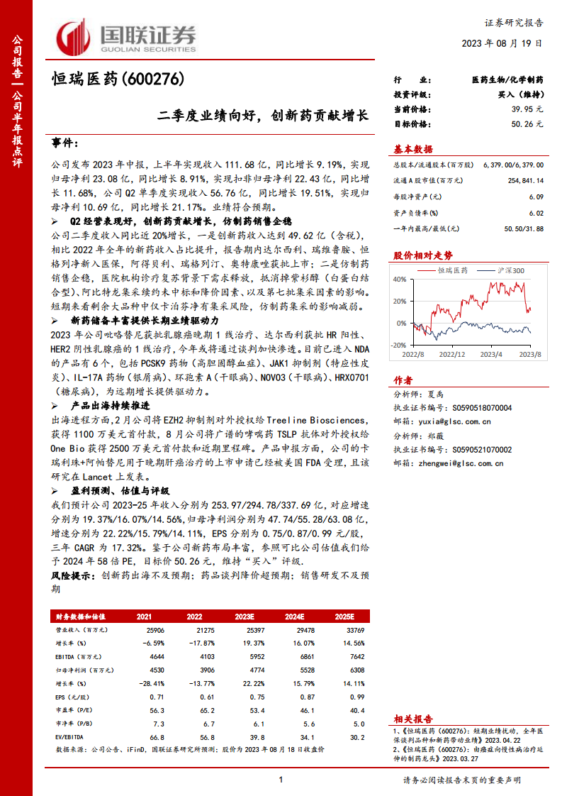 恒瑞医药(600276):二季度业绩向好,创新药贡献增长