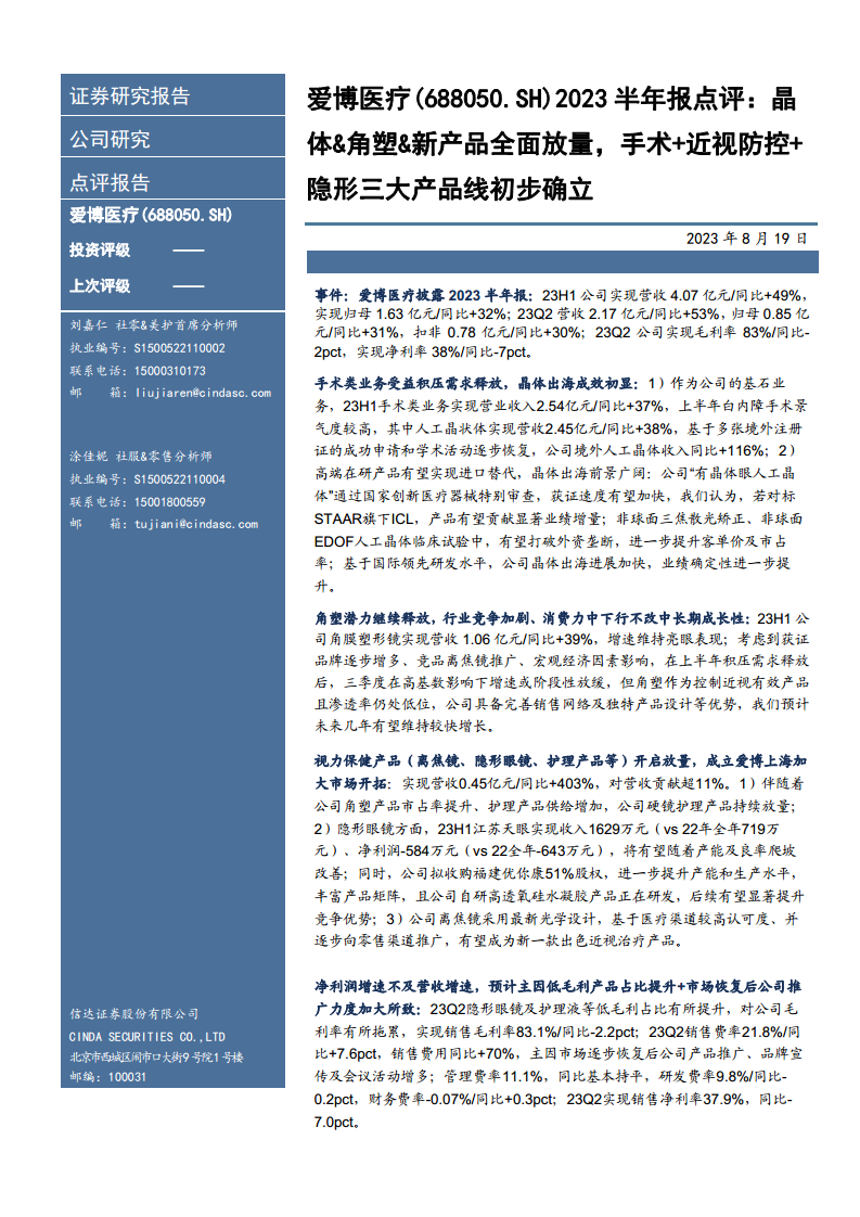 爱博医疗(688050)2023半年报点评:晶体、角塑、新产品全面放量,手术+近视防控+隐形三大产品线初步确立