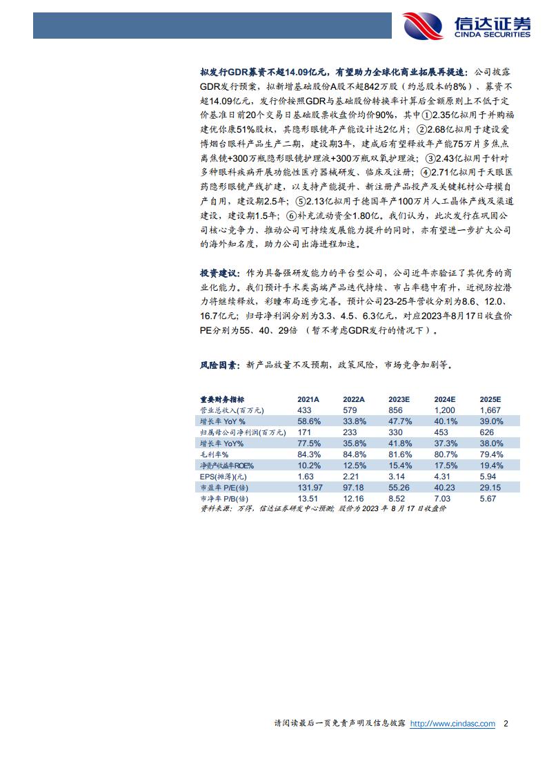 爱博医疗在2023年上半年展现出强劲的增长势头,营收和归母净利润均实现大幅增长。公司通过手术类、角膜塑形镜和视力保健三大产品线的协同发展,成功实现了业务多元化和新产品放量。特别是境外人工晶体业务的快速增长和视力保健产品线的爆发,凸显了公司的市场拓展能力。此外,公司拟通过GDR募资,进一步加大对产能扩张、研发创新和全球化布局的投入,有望巩固其在眼科医疗器械领域的领先地位并加速国际化进程。尽管面临新产品放量、政策变化和市场竞争加剧等风险,但凭借其强大的研发和商业化能力,爱博医疗预计未来几年将继续保持高速增长。