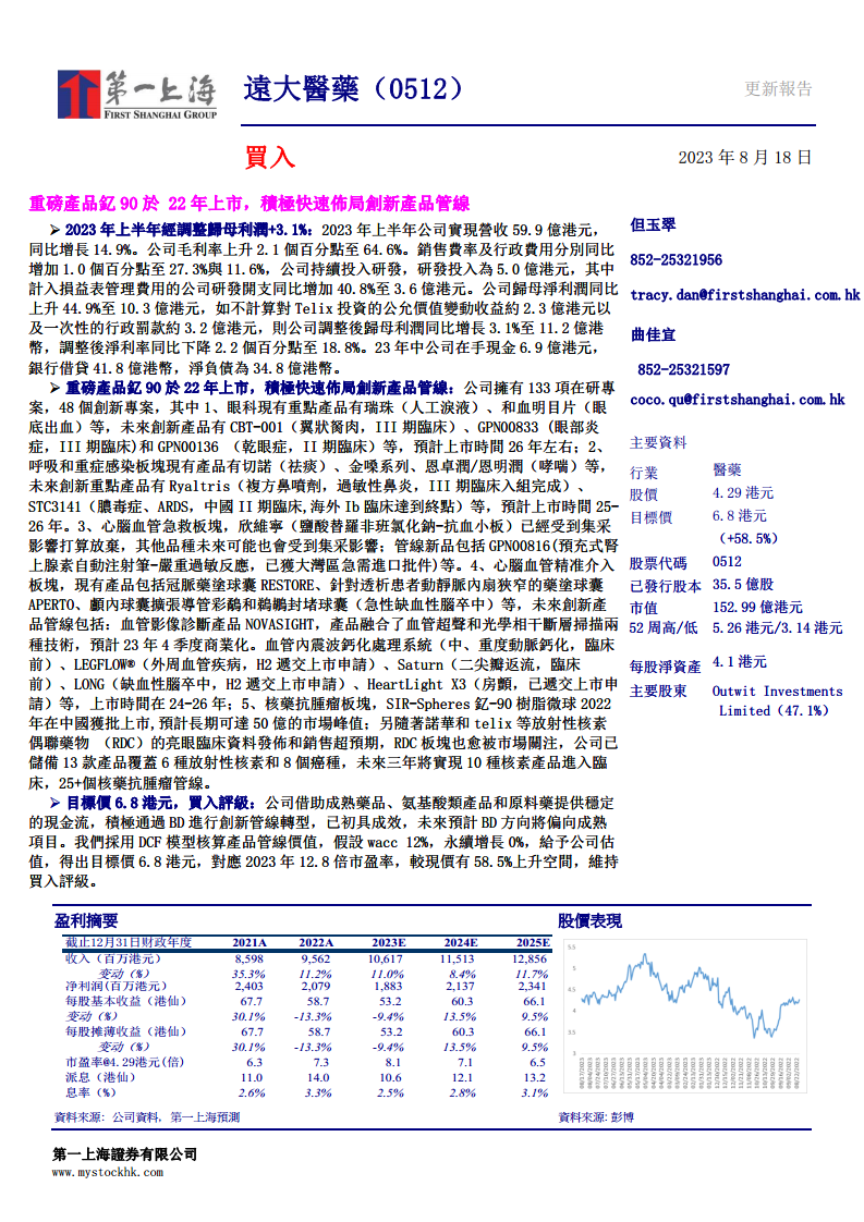 远大医药(0512.HK)重磅产品钇90于22年上市,积极快速布局创新产品管线