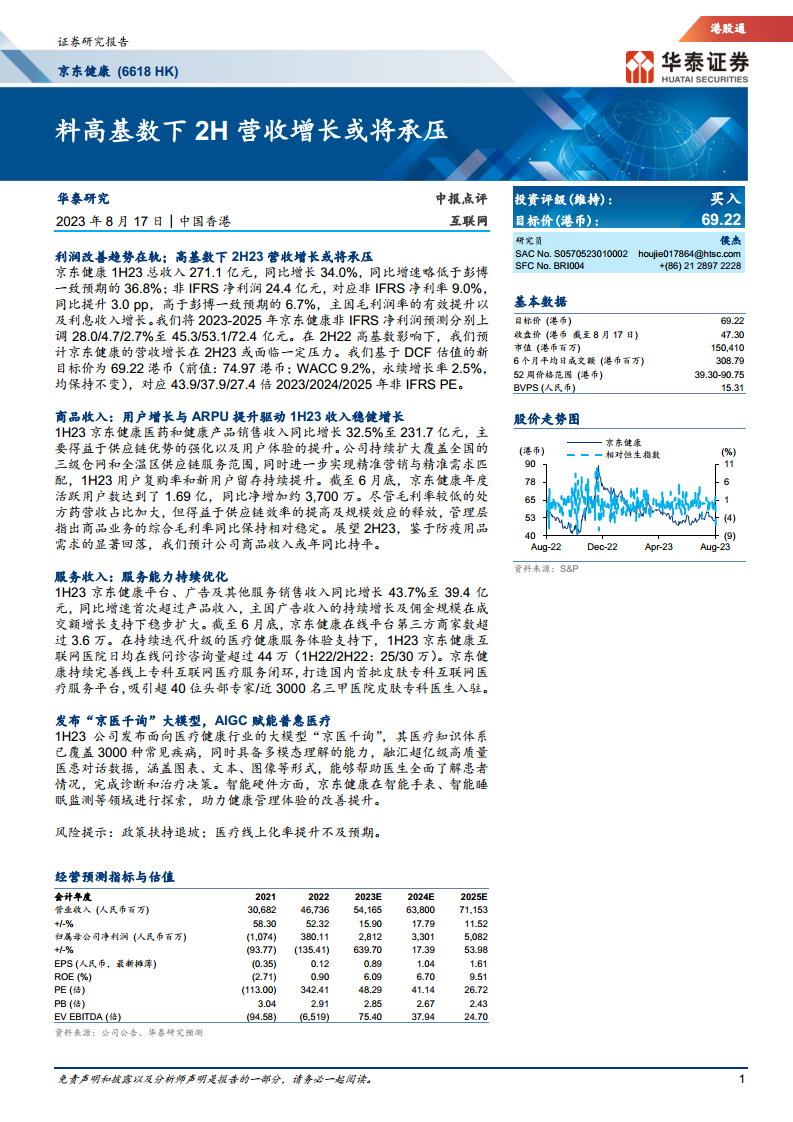 京东健康在2023年上半年实现了非IFRS净利润的显著增长和净利率的提升,显示出其在盈利能力方面的优化。尽管受高基数和防疫用品需求回落影响,下半年营收增长面临压力,导致全年营收预测被下调,但公司通过强化供应链、扩大用户规模、优化服务能力,实现了商品收入的稳健增长和服务收入的快速提升。同时,公司积极布局医疗大模型和智能硬件,以科技创新驱动长期发展。华泰研究维持“买入”评级,并基于DCF估值调整目标价至69.22港币,同时提示了政策和线上化率提升不及预期的风险。