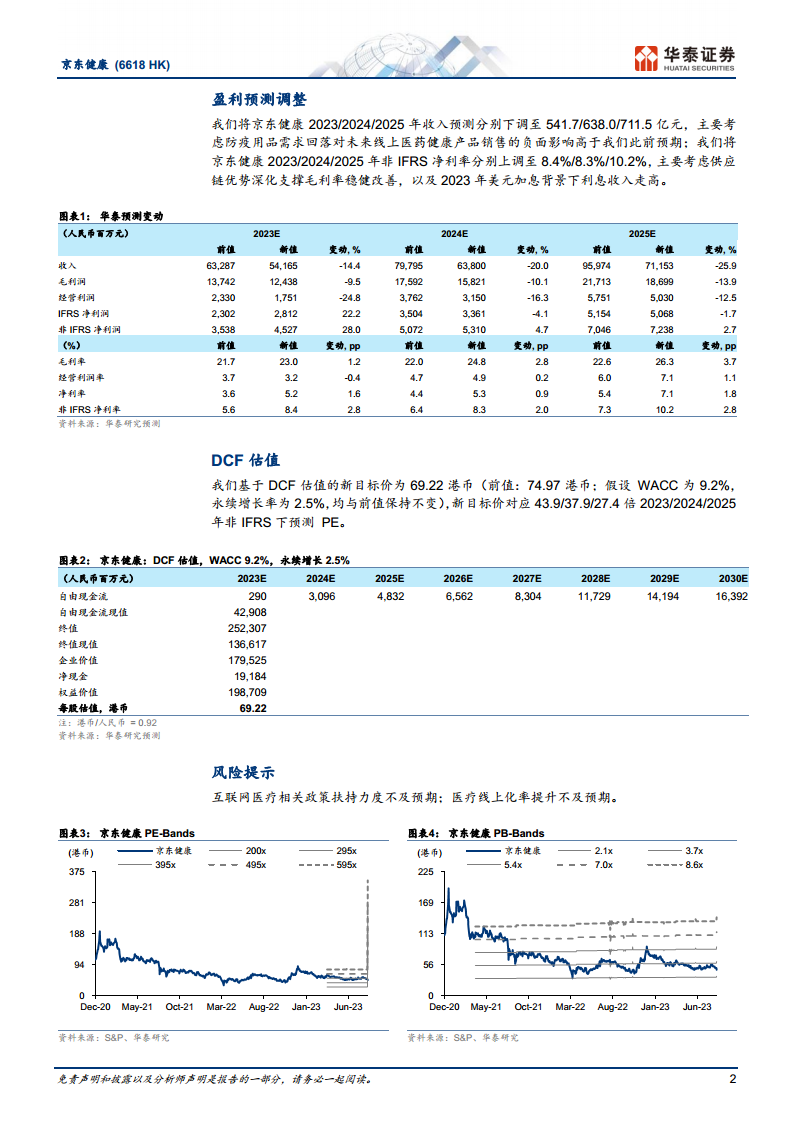 基于DCF估值模型,华泰研究将京东健康的新目标价设定为69.22港币(前值为74.97港币),WACC和永续增长率分别维持9.2%和2.5%不变。新目标价对应2023/2024/2025年非IFRS PE分别为43.9/37.9/27.4倍。