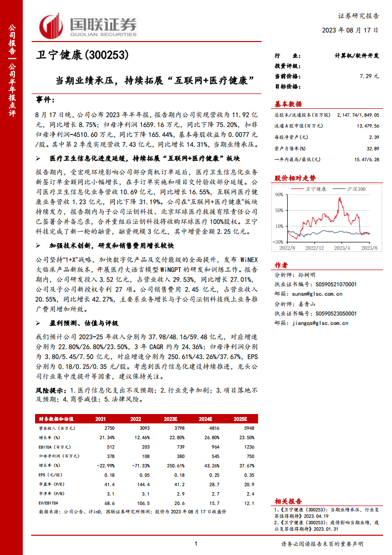卫宁健康(300253):当期业绩承压,持续拓展“互联网+医疗健康”