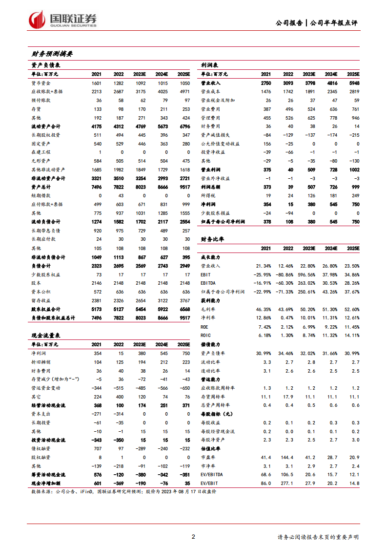 国联证券研究所预计卫宁健康2023-2025年营业收入将分别达到37.98亿元、48.16亿元和59.48亿元,对应增速分别为22.80%、26.80%和23.50%,三年复合年均增长率(CAGR)约为24.36%。归母净利润预计分别为3.80亿元、5.45亿元和7.50亿元,对应增速分别为250.61%、43.26%和37.67%。每股收益(EPS)预计分别为0.18元/股、0.25元/股和0.35元/股。