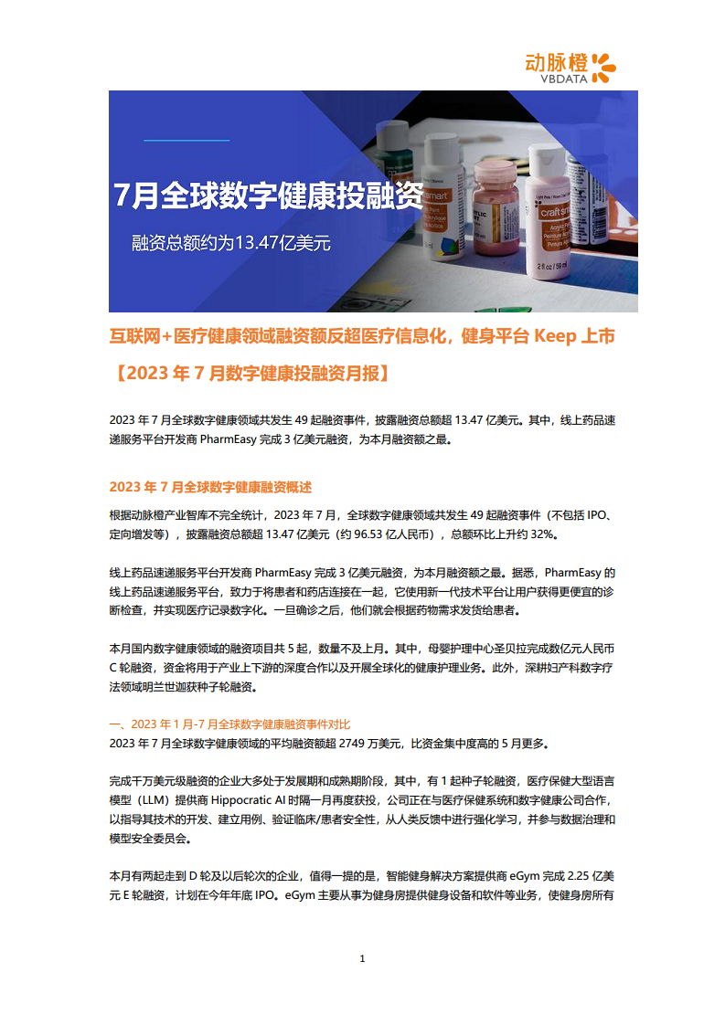 2023年7月数字健康投融资月报-互联网+医疗健康领域融资额反超医疗信息化,健身平台Keep上市