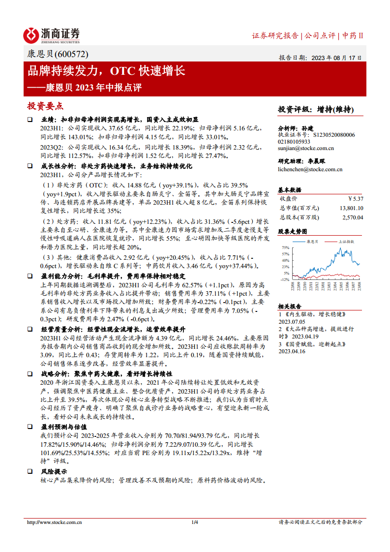 康恩贝2023年上半年业绩表现亮眼,扣除非经常性损益后的归母净利润实现高速增长,归母净利润更是大幅提升,充分显示出公司在国资入主后的经营改善和战略转型成效。非处方药业务作为核心驱动力,实现了快速增长和业务占比提升,带动整体毛利率改善。同时,公司经营性现金流充裕,营运效率显著提升,各项财务指标均呈现积极态势。