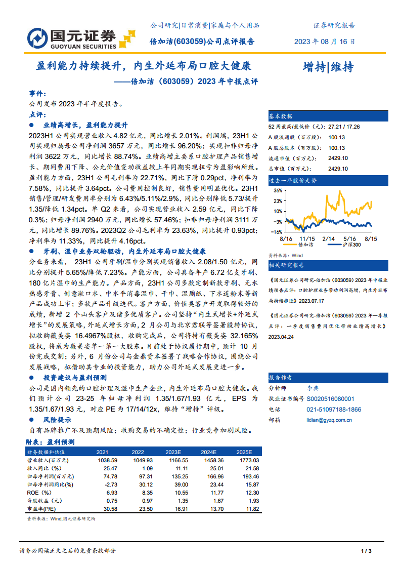 倍加洁在2023年上半年展现出强劲的业绩增长势头,归母净利润同比大幅增长96.20%,主要得益于口腔护理产品销售的拉动、期间费用的有效控制以及公允价值变动收益的积极影响。公司盈利能力持续提升,尤其在第二季度,毛利率和净利率均有显著改善。在业务层面,公司坚持牙刷和湿巾双轮驱动,并通过不断推出新产品和拓展客户,巩固市场地位。更重要的是,倍加洁积极推进“内生式增长+外延式增长”的战略,通过收购薇美姿股权成为其第一大股东,并与金鼎资本合作,加速在口腔大健康领域的战略布局。基于对公司未来发展的积极预期,分析师维持“增持”评级,并预测未来三年归母净利润将持续增长,但同时提示了自有品牌推广、收购交易不确定性及行业竞争加剧等潜在风险。