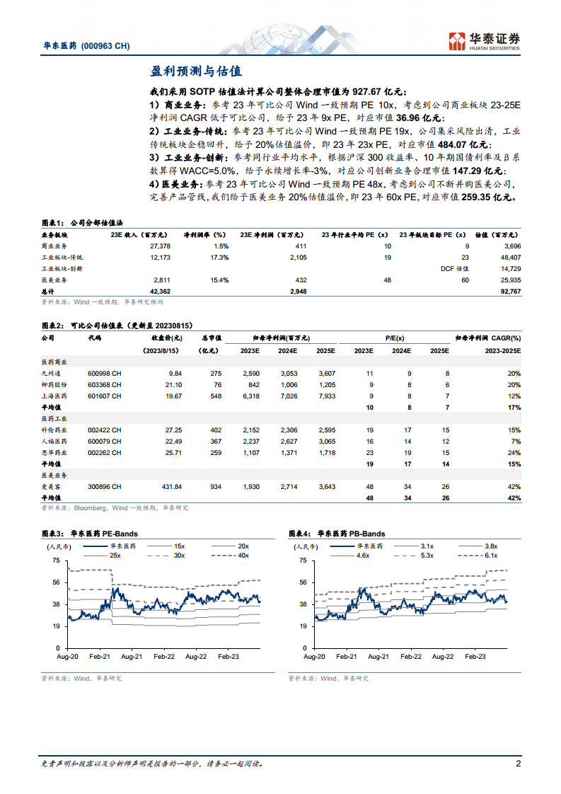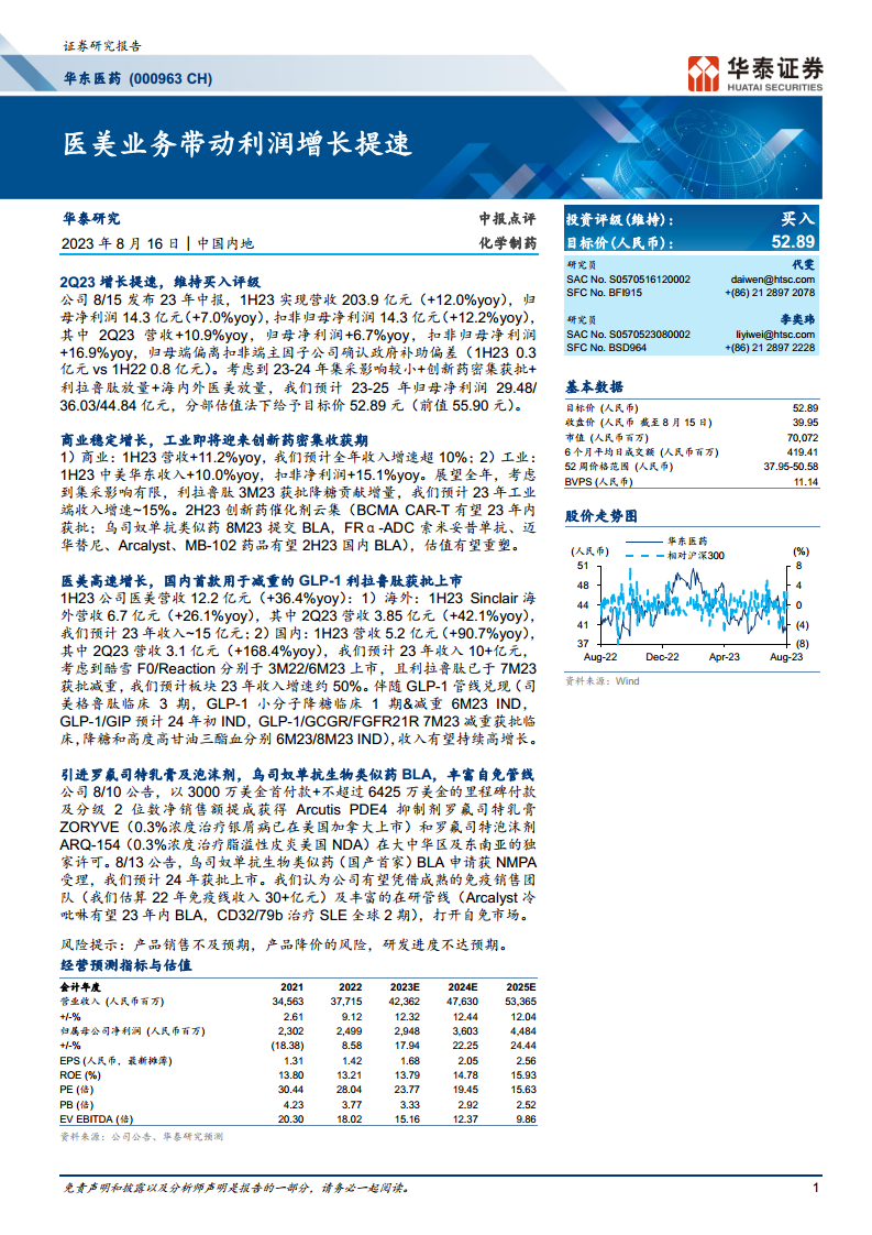 华东医药在2023年上半年表现出强劲的增长势头,特别是医美业务和创新药管线的积极进展成为公司利润增长提速的关键驱动力。公司商业板块保持稳定,工业板块在创新药密集获批的背景下迎来估值重塑机遇。医美业务,尤其是GLP-1减重产品的获批,预示着该板块将持续高速增长。同时,公司通过引进和申报自免管线产品,进一步拓宽了市场空间。尽管面临产品销售不及预期、产品降价和研发进度不达预期等风险,但基于其多元化的业务布局、强大的创新能力和清晰的增长路径,华泰研究维持“买入”评级,并预计未来几年公司业绩将持续向好。