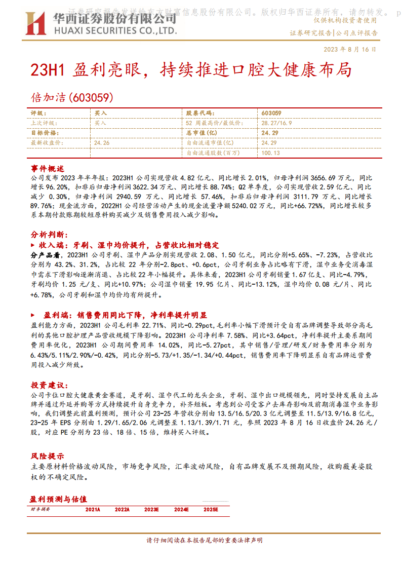 华西证券维持对倍加洁的“买入”评级。公司被定位为口腔大健康黄金赛道的卡位者,是牙刷、湿巾代工的龙头企业,出口规模领先。公司坚持发展自主品牌,并通过外延并购等方式持续提升自身竞争力,以补齐短板。 考虑到公司受客户去库存影响及前期消毒湿巾业务影响,华西证券调整了盈利预测:
