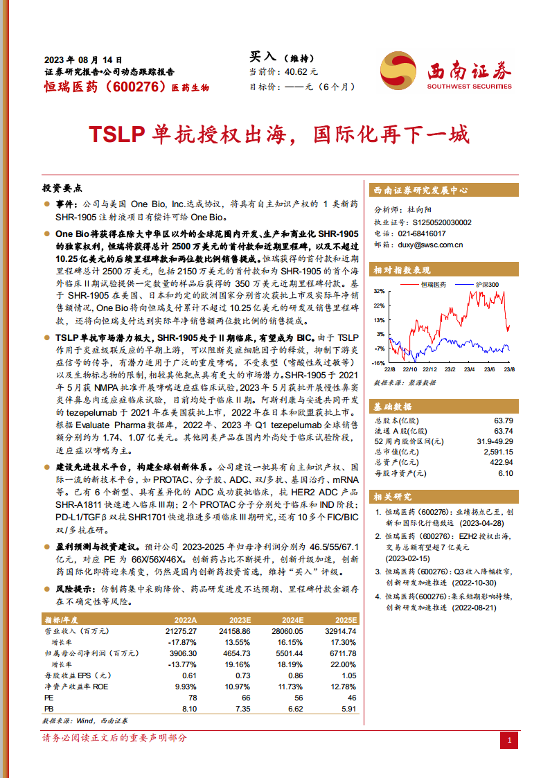 TSLP单抗市场潜力巨大,SHR-1905作为处于临床Ⅱ期的产品,有望成为同类最佳(BIC)产品,具备广阔的市场前景。基于创新药占比的不断提升和创新升级的加速,公司预计在2023-2025年归母净利润将持续实现两位数增长,盈利能力和估值水平将持续优化,展现出显著的投资价值。