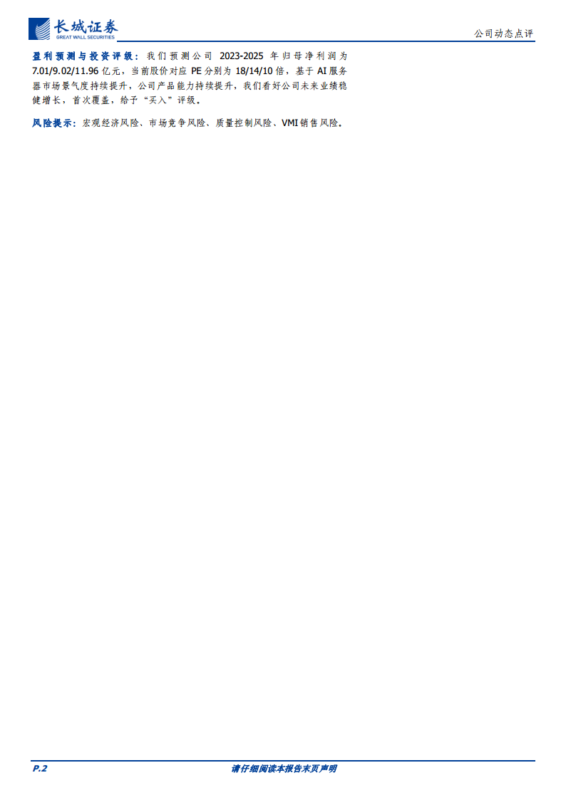 基于AI服务器市场景气度持续提升以及公司产品能力的持续增强,长城证券看好公司未来业绩稳健增长,首次覆盖并给予“买入”评级。