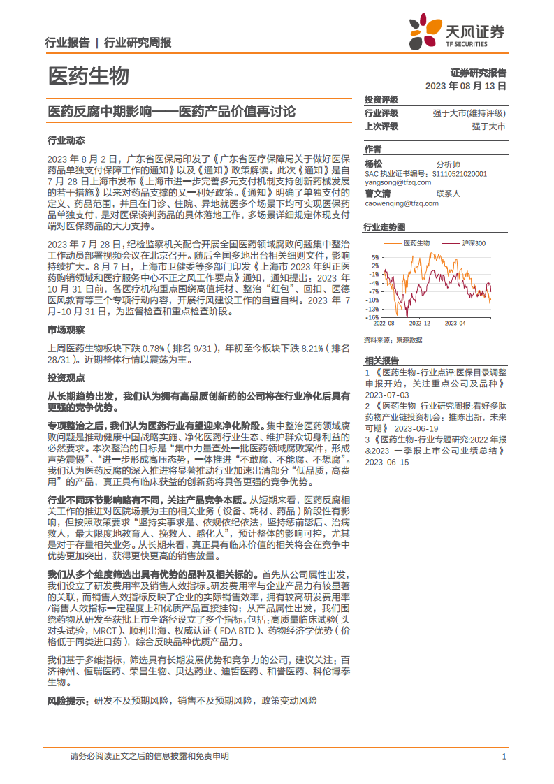 报告强调,在医药反腐的背景下,医药产品的价值将回归其临床获益和创新本质。短期内,反腐行动可能对以医院场景为主的业务造成阶段性影响,但长期来看,真正具备临床价值和药物经济学优势的创新药械将脱颖而出,获得更强的竞争优势和更快的销售放量。因此,投资策略应聚焦于那些拥有高品质创新药、高研发投入、高销售效率以及具备高质量临床试验、顺利出海、权威认证和药物经济学优势的产品及相关企业。