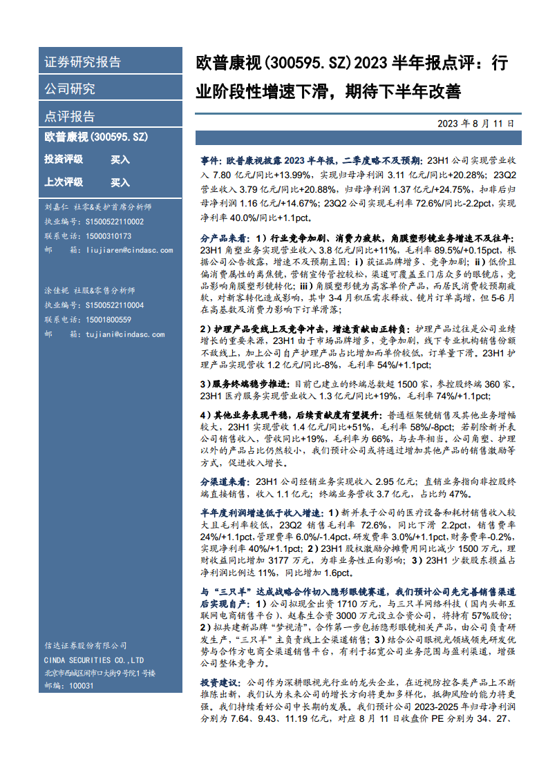 欧普康视2023年上半年业绩保持增长,但二季度增速放缓,主要受角膜塑形镜业务面临的激烈市场竞争、消费力疲软以及护理产品业务下滑等挑战影响。公司积极应对,通过稳健发展医疗服务终端和提升其他业务贡献,并与“三只羊”达成战略合作,切入隐形眼镜赛道,旨在拓宽业务边界并强化线上销售能力。尽管短期内面临行业阶段性增速下滑的压力,但公司通过多元化布局和创新合作,有望在下半年实现改善,并持续看好其中长期发展潜力。投资者需关注新产品放量、政策变化及市场竞争加剧等潜在风险。