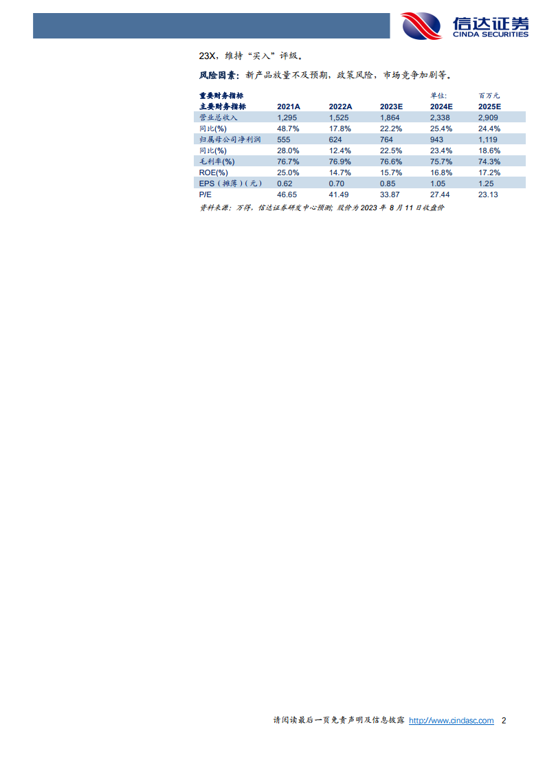 23年第二季度,公司营收3.79亿元,同比+20.88%,环比-5.55%;归母净利润1.37亿元,同比+24.75%,环比-20.56%。毛利率72.61%,同比-2.2pct,环比-5.8pct。费用端,销售费率24%(+1.1pct),管理费率6.0%(-1.4pct),研发费率3.0%(+1.1pct)。净利率40.02%,同比+1.1pct,环比-9.2pct。