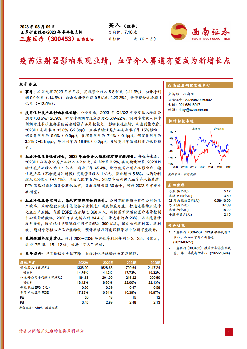 公司核心业务——血液净化业务实现稳健增长,并有望通过产业链整合和集采进一步提升市场份额,其市场潜力巨大。同时,公司积极布局血管介入新赛道,PTA高压球囊扩张导管的获批上市及丰富的在研项目,预示着该领域有望成为公司未来业绩的新增长点。基于此,分析师维持对三鑫医疗的“买入”评级,并预计未来三年归母净利润将持续增长。