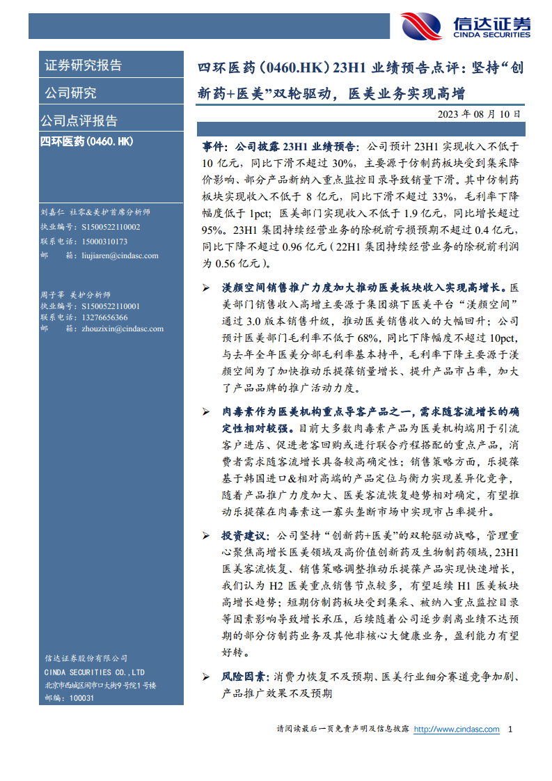 四环医药(00460)23H1业绩预告点评:坚持“创新药+医美”双轮驱动,医美业务实现高增