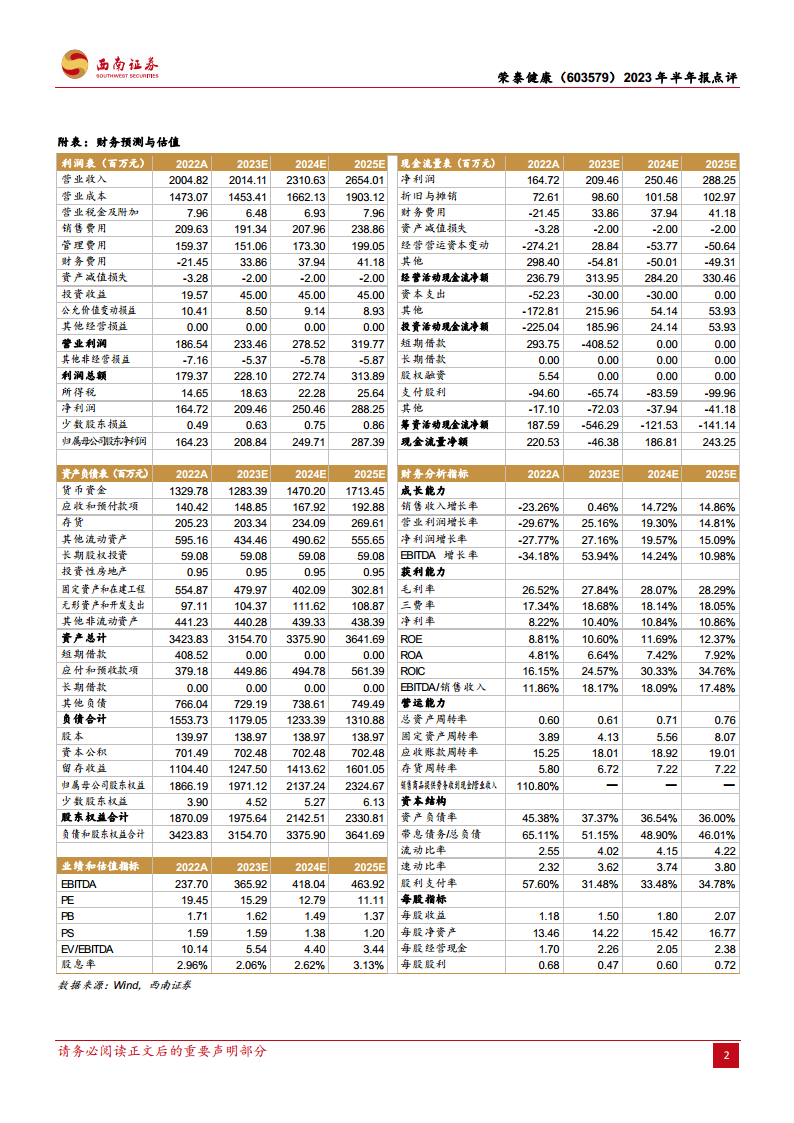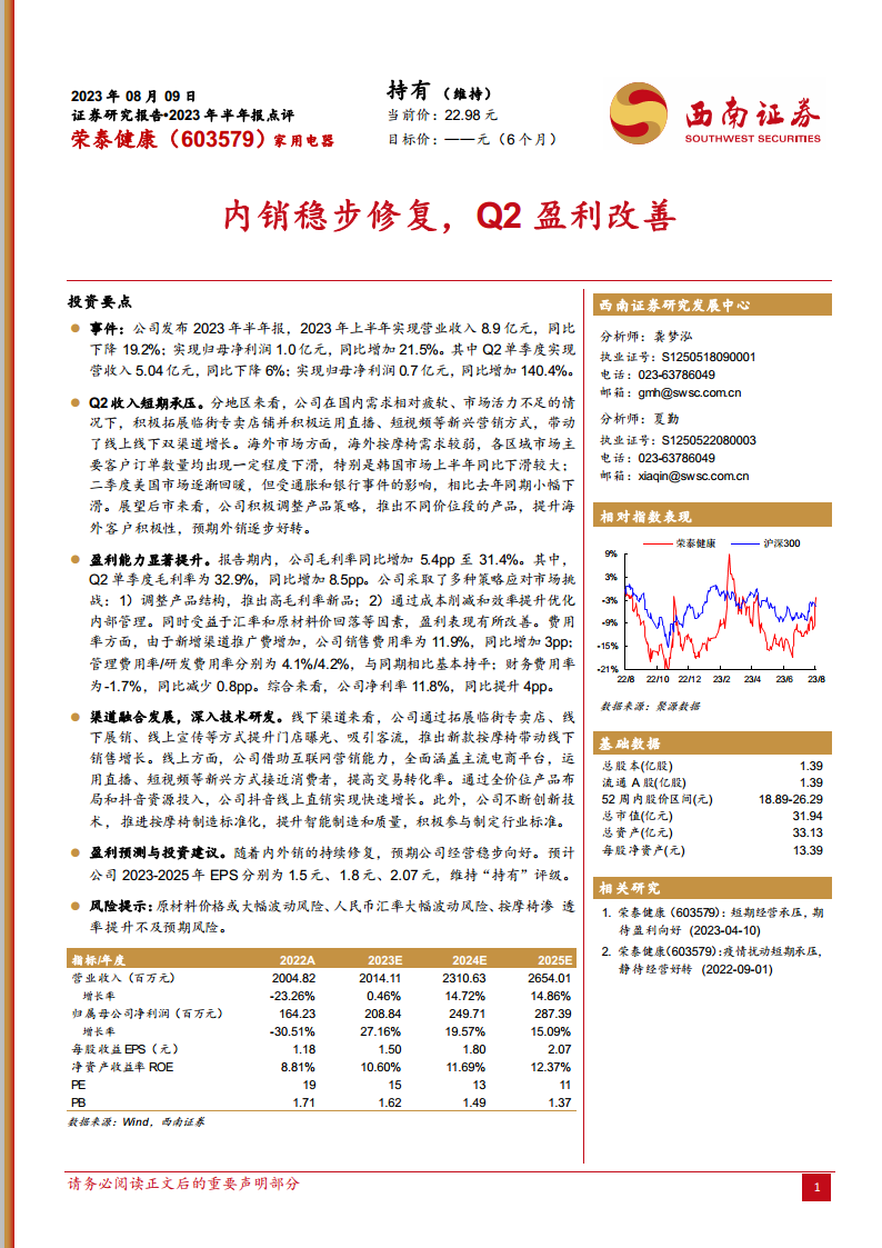 荣泰健康在2023年上半年,尽管面临宏观经济和海外市场带来的营收压力,但通过积极的产品结构调整、成本控制以及创新的营销策略,成功实现了归母净利润的显著增长和盈利能力的全面提升。公司在国内外市场展现出较强的适应性和增长潜力,尤其是在国内线上线下渠道融合发展方面取得成效,海外市场也呈现逐步回暖态势。展望未来,基于稳健的财务预测,公司业绩有望持续改善,盈利能力和估值指标均呈现积极趋势。然而,投资者仍需密切关注原材料价格、汇率波动以及市场渗透率等潜在风险因素。