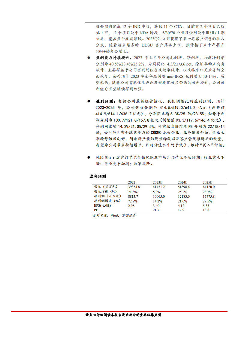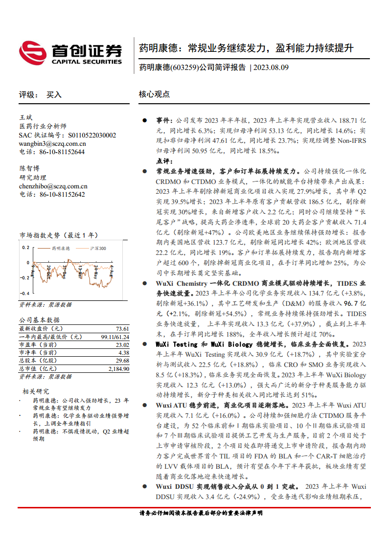 药明康德在2023年上半年展现出强劲的常规业务增长和持续提升的盈利能力,这主要得益于其一体化CRDMO/CTDMO模式的有效实施、全球客户和订单的持续拓展,以及各业务板块的协同发展。尽管面临短期业务迭代压力,但TIDES和DDSU等创新业务的快速放量和模式突破预示着长期增长潜力。公司盈利能力的优化和稳健的财务预测,结合其在全球CRDMO市场的领先地位和相对较低的估值,使其具备持续增长的潜力。首创证券维持“买入”评级,但同时提示了市场开拓、行业需求、竞争和政策等方面的潜在风险。