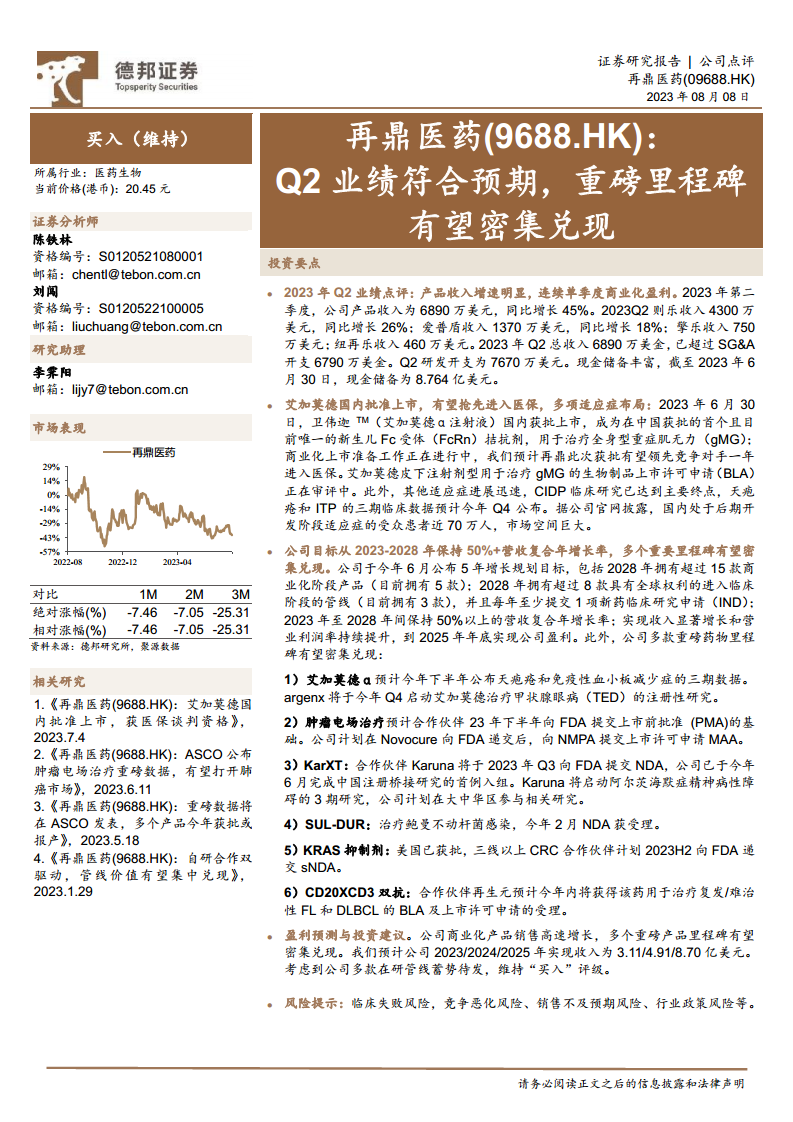 再鼎医药(09688):Q2业绩符合预期,重磅里程碑有望密集兑现