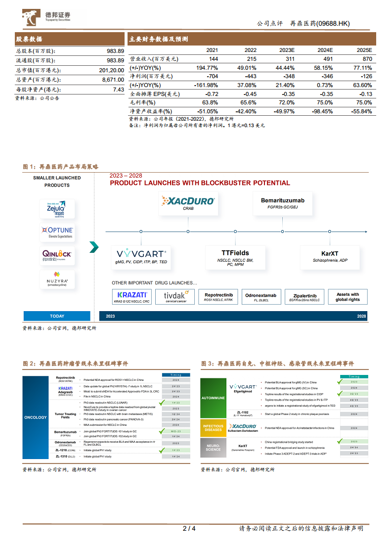 再鼎医药在2023年第二季度展现出强劲的商业化势头,产品收入同比增长45%,并首次实现单季度商业化盈利,这得益于则乐、爱普盾等核心产品的稳健表现。艾加莫德(卫伟迦™)在中国获批上市是公司本季度最重要的里程碑之一,作为首个FcRn拮抗剂,其有望凭借医保先机和庞大的潜在患者群体(近70万人)迅速打开市场,并已在多项适应症上取得积极进展。公司发布的2023-2028年五年增长规划,明确了50%以上的营收复合年增长率目标,并承诺在2025年底实现盈利,同时计划大幅扩充商业化产品和全球临床管线。未来,包括艾加莫德α、肿瘤电场治疗、KarXT等在内的多款重磅药物的关键里程碑事件将密集兑现,为公司持续增长提供强大动力。德邦证券基于这些积极因素,维持对再鼎医药的“买入”评级,并预测其营收将持续高速增长,亏损将逐步收窄,最终实现盈利目标。
